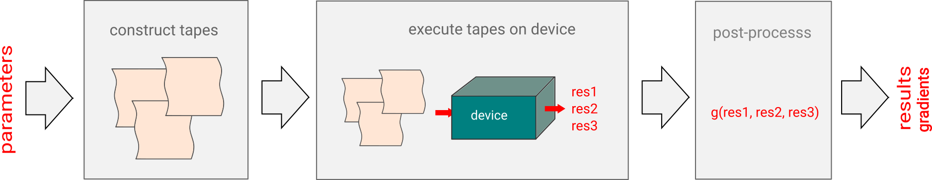 The internal workflow in the QNode is surprisingly similar in both cases, and consists of three steps: to construct one or more tapes using the quantum function, to run the tapes on the device, and to post-process the results. The classical processing of this pipeline maintains differentiability, so that we can not only compute the result, but the gradient of the result with respect to the trainable parameters.